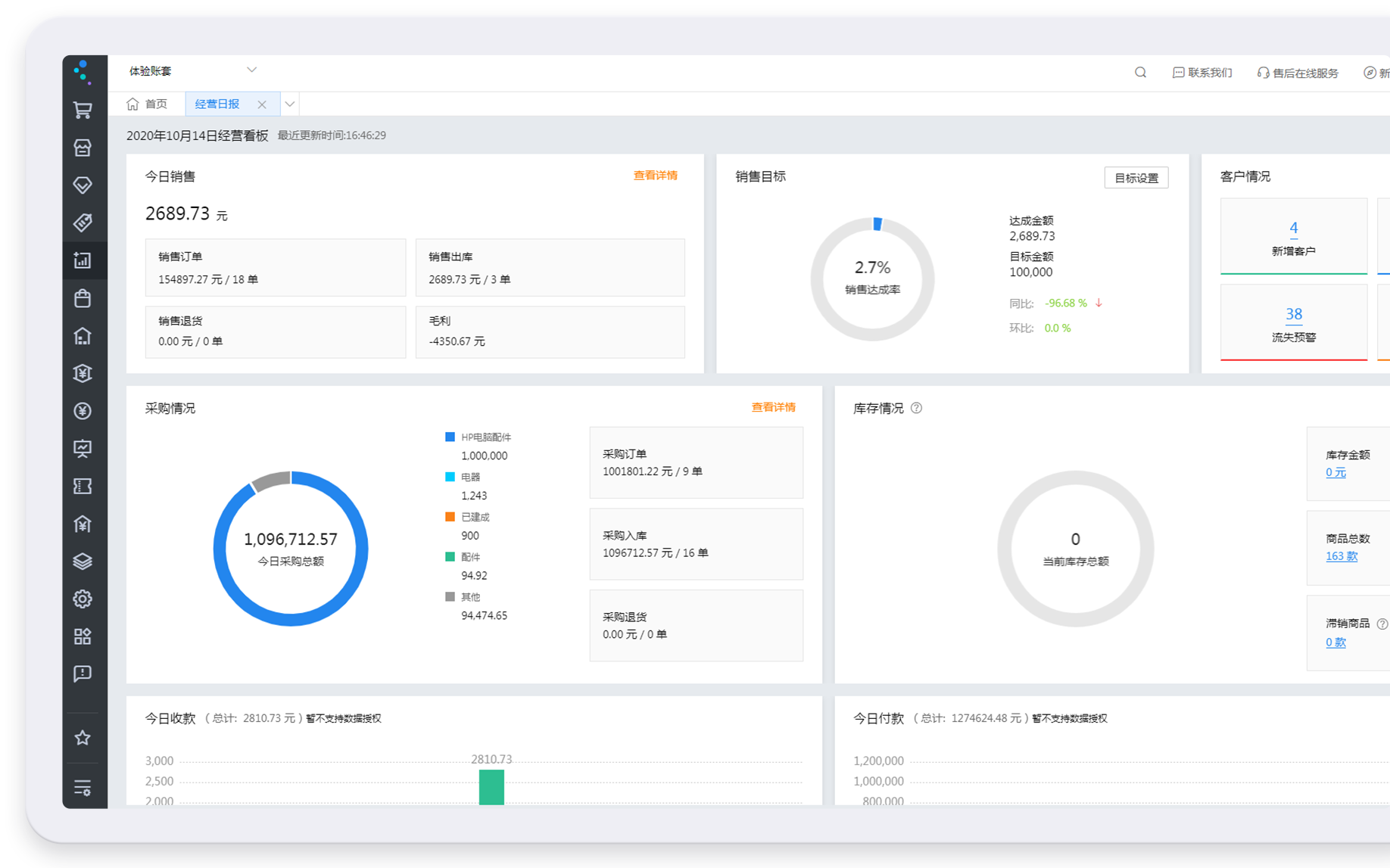 构建企业线上和线下一体化经营能力,采购、销售、收款、发票、出入库等全流程业务跟踪,实现业务流程闭环管理